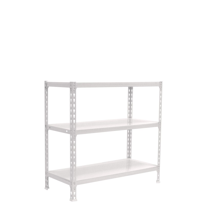 Estantería metálica sin tornillos de color BLANCO/BLANCO con capacidad de carga por estante de 180 kg. El número de estantes es 3 y las medidas (alto x ancho x fondo) son 900x1000x300 mm. La única estantería que permite poner las bandejas en tres posiciones diferentes. Producto español, calidad europea, podrás encontrar las intrucciones de montaje en su interior o en este enlace: https://www.youtube.com/watch?v=u3t2f21Mm7I. Medidas en uso del producto: 877x1100x310 mm