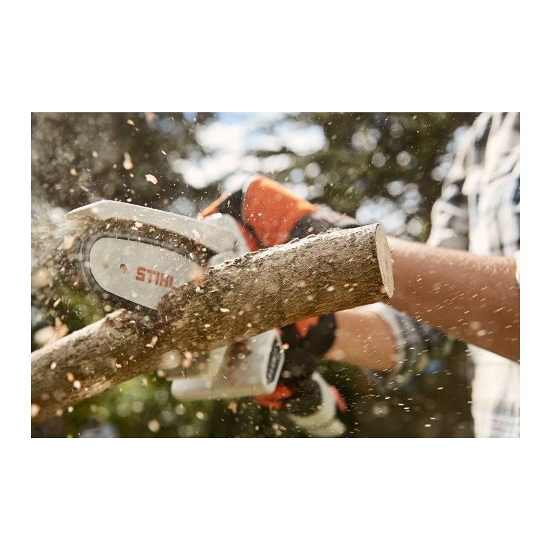 Con batería AS 2 y cargador estándar AL 1. Para podar árboles y setos y triturar cortes verdes.