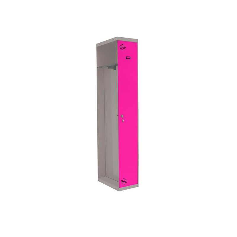 Taquilla metálica de 1 cuerpo con 1 puertas de color gris y las puertas rosas. Las dimensiones son 1800x500x500 mms. Se entrega desmontado e incluye un estante, perchero, una cerradura, respiradero y etiquetero para mayor comodidad del usuario. Se monta de forma fácil siguiendo las instrucciones o viendo el vídeo de montaje en Youtube. Este es un módulo adicional que necesita una inicial al que asociarse.Incluye un separador o divisor interno que sirve para separar el espacio interior.