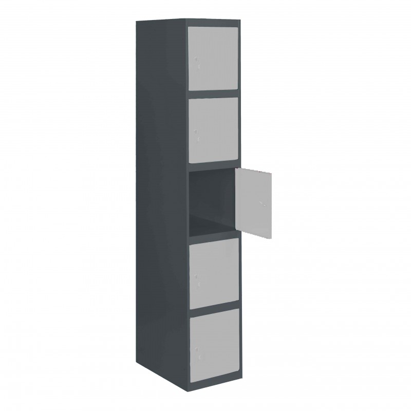 Casillero metálico de 1 cuerpo con 5 puertas de color gris y las puertas blancas. Las dimensiones son 1800x300x500 mms. Se entrega desmontado e incluye un estante, perchero, una cerradura, respiradero y etiquetero para mayor comodidad del usuario. Se monta de forma fácil siguiendo las instrucciones o viendo el vídeo de montaje en Youtube.