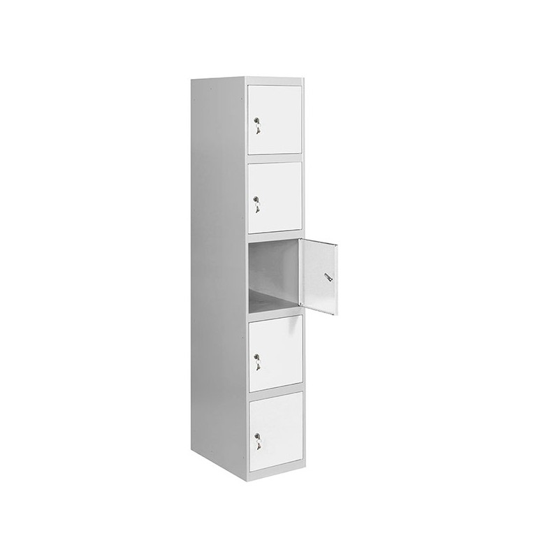 Casillero metálico de 1 cuerpo con 5 puertas de color gris y las puertas blancas. Las dimensiones son 1800x400x500 mms. Se entrega desmontado e incluye un estante, perchero, una cerradura, respiradero y etiquetero para mayor comodidad del usuario. Se monta de forma fácil siguiendo las instrucciones o viendo el vídeo de montaje en Youtube.