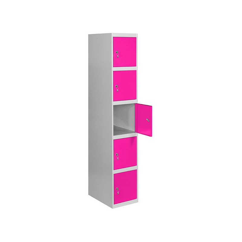 Casillero metálico de 1 cuerpo con 5 puertas de color gris y las puertas rosas. Las dimensiones son 1800x400x500 mms. Se entrega desmontado e incluye un estante, perchero, una cerradura, respiradero y etiquetero para mayor comodidad del usuario. Se monta de forma fácil siguiendo las instrucciones o viendo el vídeo de montaje en Youtube.
